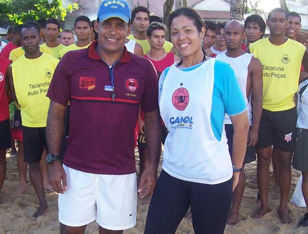 Preparadora física do Íbis, Carol Gama, ao lado do auxiliar Bena em treino na praia (Foto: Divulgação)